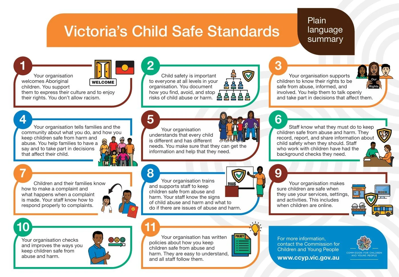 Our service implements the Child Safe Standards to build and maintain a culture where child safety is a shared responsibility. We take steps to ensure the health, safety and wellbeing of children at all times, whilst also promoting their learning and development. A plain language summary of the Child Safe Standards can be found below; -
